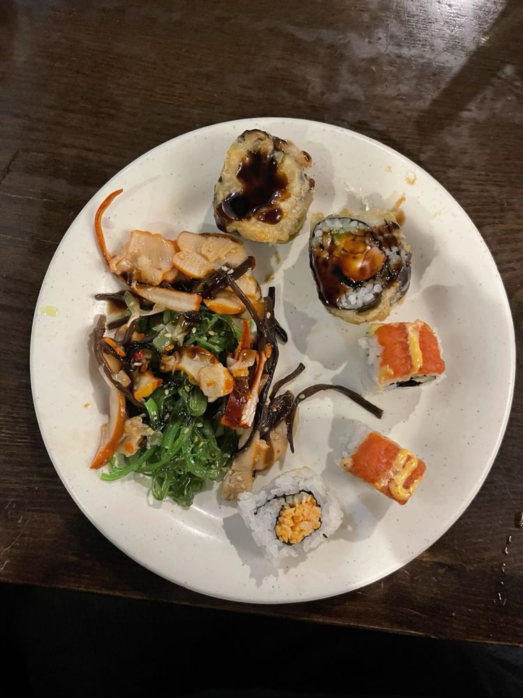 Smoked salmon, cream cheese, and avocado, rolled in sushi rice and seaweed.