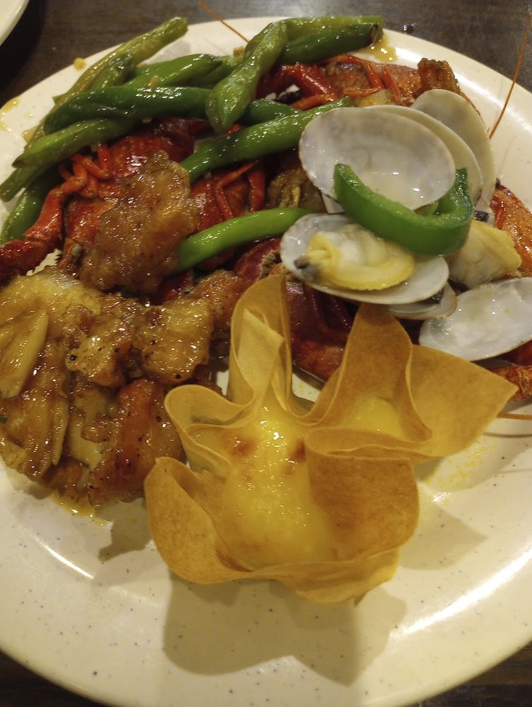 Shrimp, chicken, beef, pork, lobster, and scallops with assorted Chinese vegetables in brown sauce.